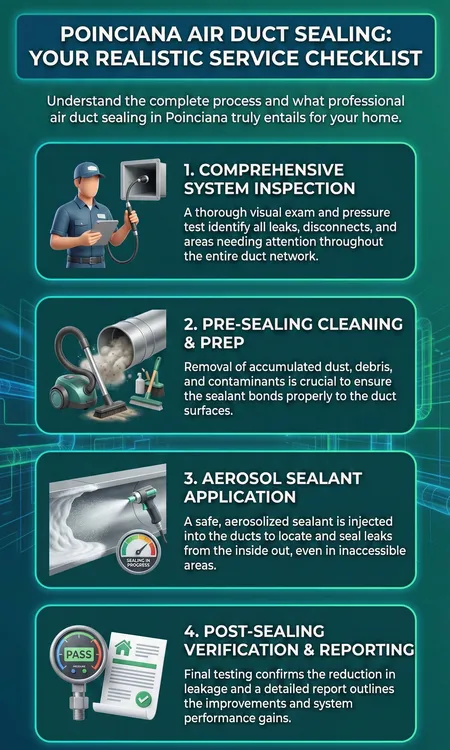 This checklist covers what professional air duct sealing in Poinciana actually includes—the realistic process that separates thorough work from surface-level patch jobs. Most Poinciana homes built in the last 15 years lose 25-40% of conditioned air through ductwork. The question isn't whether your ducts leak—it's whether the crew fixing them actually tests, accesses, and verifies the work was done right.